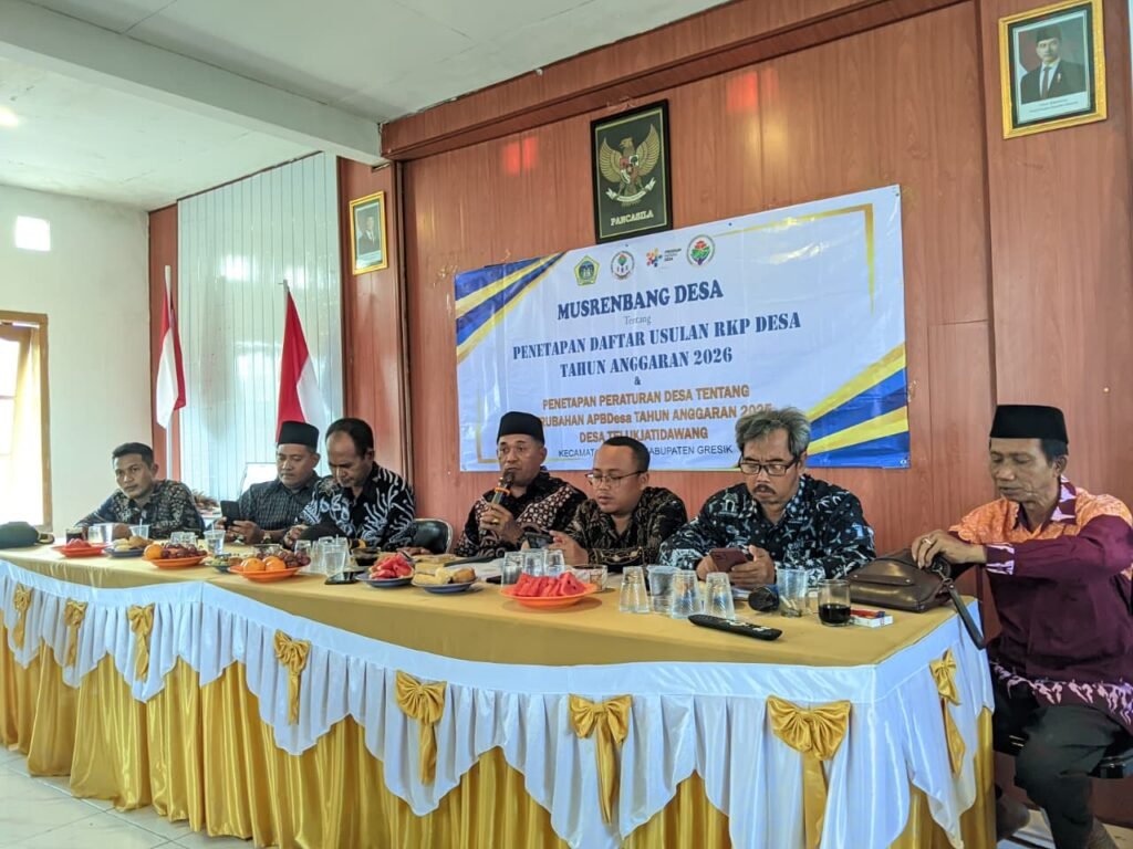 Senin, 1 September 2025 telah dilaksanakan kegiatan Musyawarah Rencana Pembangunan (MUSRENBANG) Desa Penetapan Daftar Usulan RKP Desa (DU-RKPDes) Tahun 2026 dan Penetapan Perdes Tentang Perubahan APBDes Tahun Anggaran 2025 Desa Telukjatidawang Kecamatan Tambak Kabupaten Gresik. Kegiatan ini dimulai pukul 09.00 WIB s/d Selesai, yang bertempat di Aula Balai Desa Telukjatidawang.
